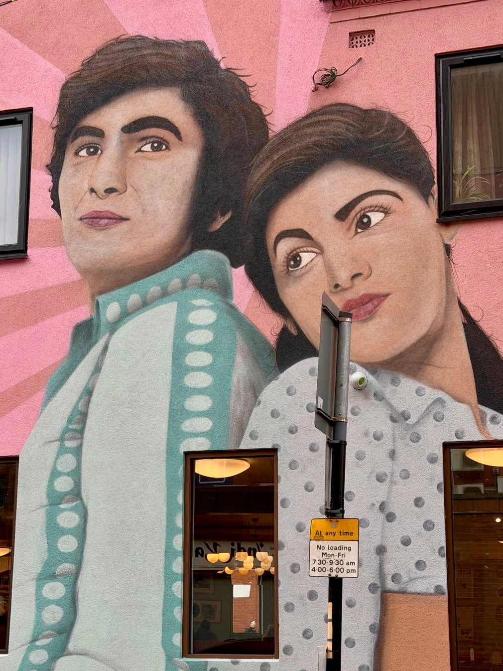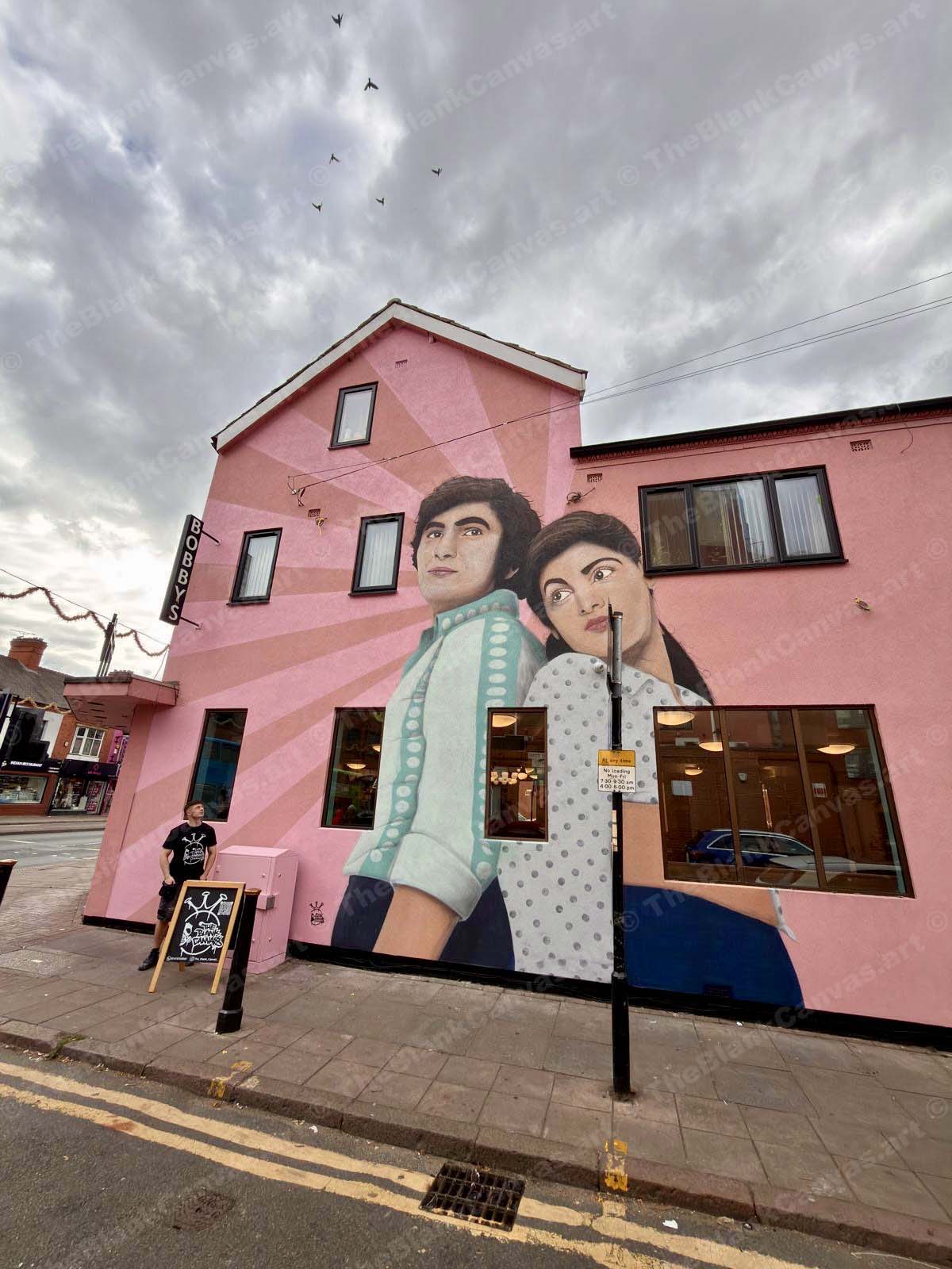 A large-scale spray-painted mural standing 32 feet high, featuring portraits of Bollywood legends Rishi Kapoor and Dimple Kapadia from the 1973 film Bobby. Created over five days to celebrate the 50th anniversary of Bobby’s Restaurant – originally named after the film – and unveiled to coincide with Diwali, this piece pays tribute to both cinematic and local cultural heritage, located along the famous Golden Mile in Leicester.