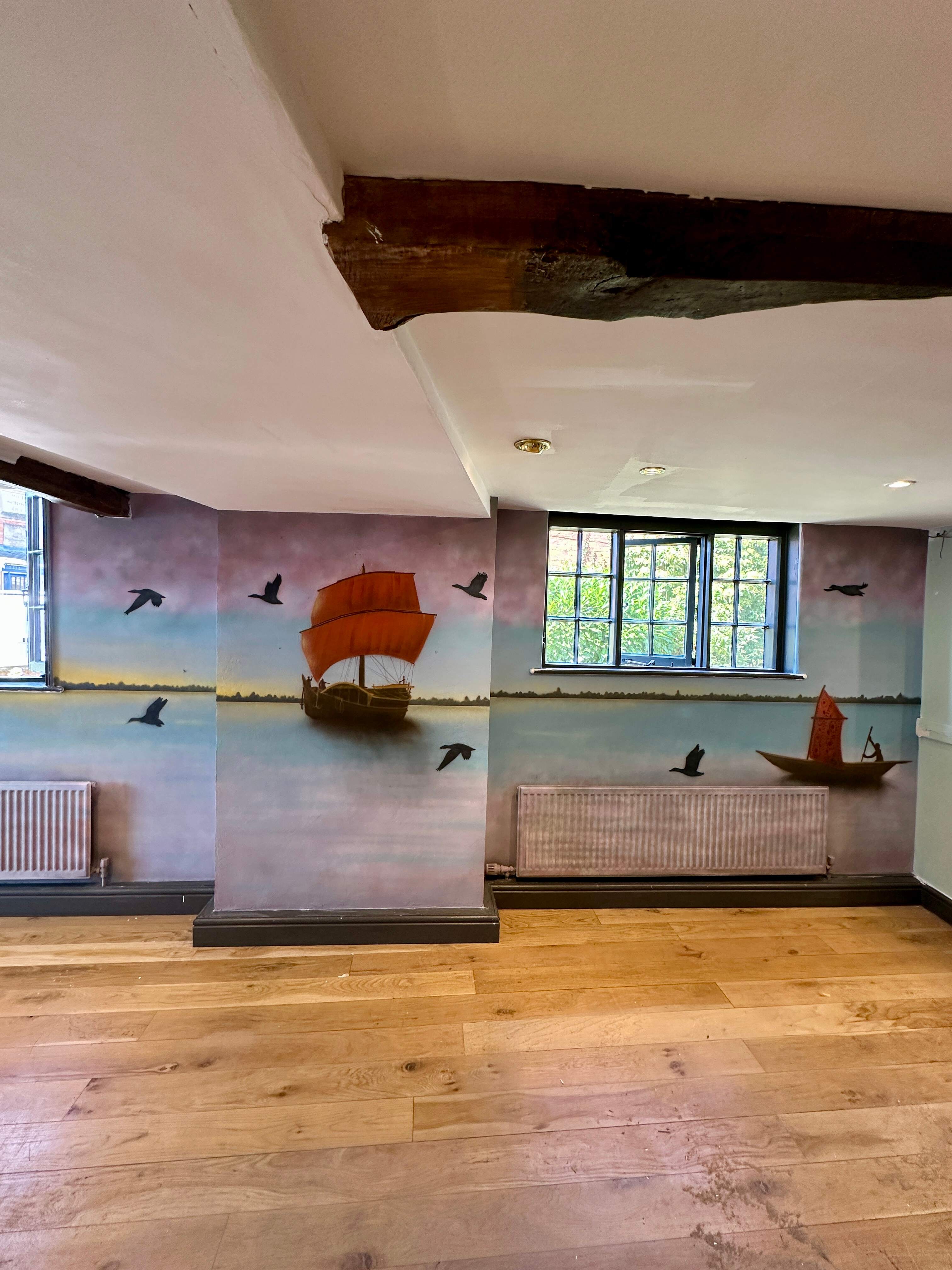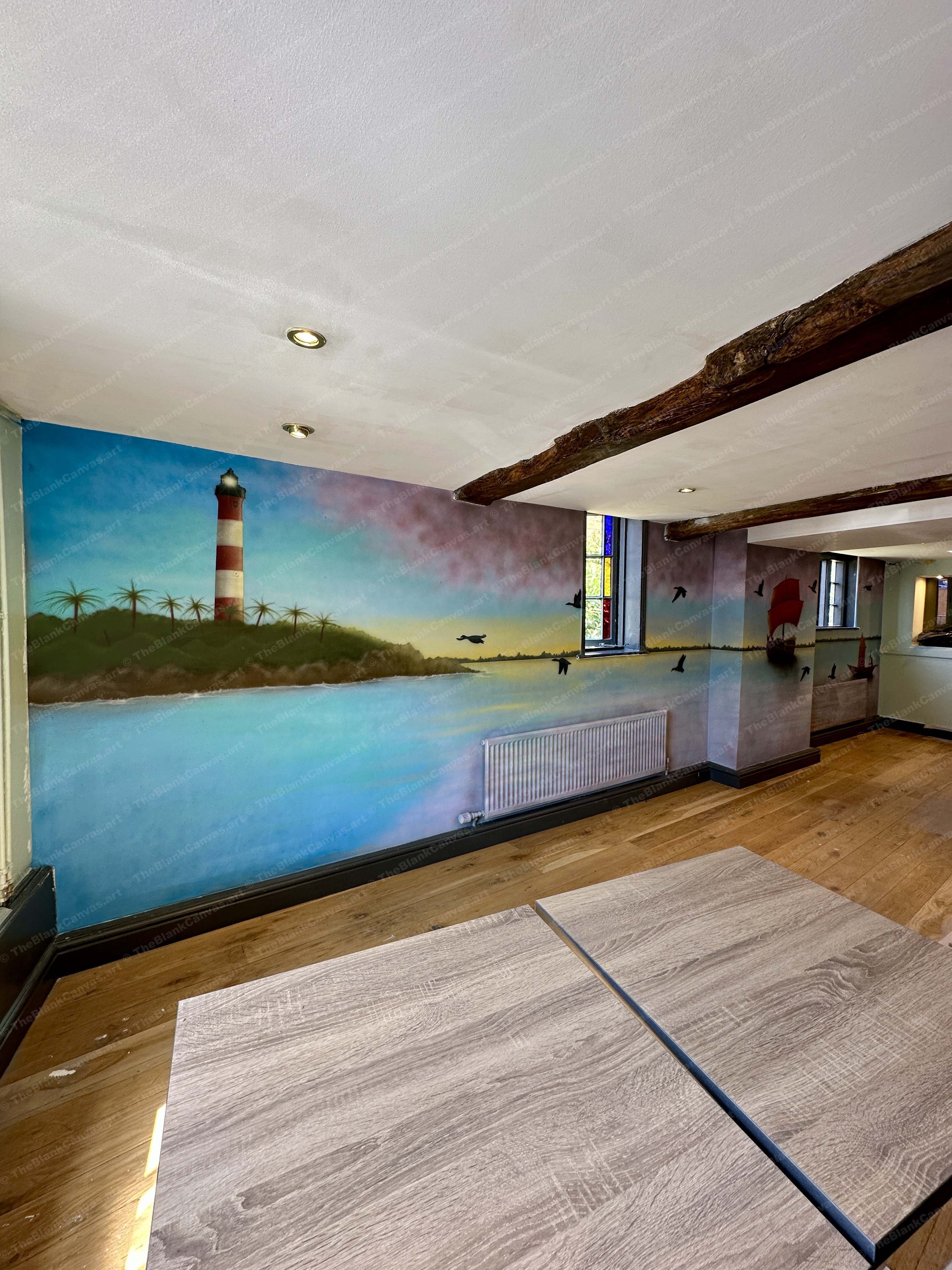 A hand-painted mural inspired by the coastal beauty of Bangladesh, created for The Lighthouse restaurant in Kibworth Leicestershire. The artwork features a traditional lighthouse, Bengali fishing boats, and Ducks in flight against a warm sunset sky, bringing a sense of serenity and cultural authenticity to the dining space.
