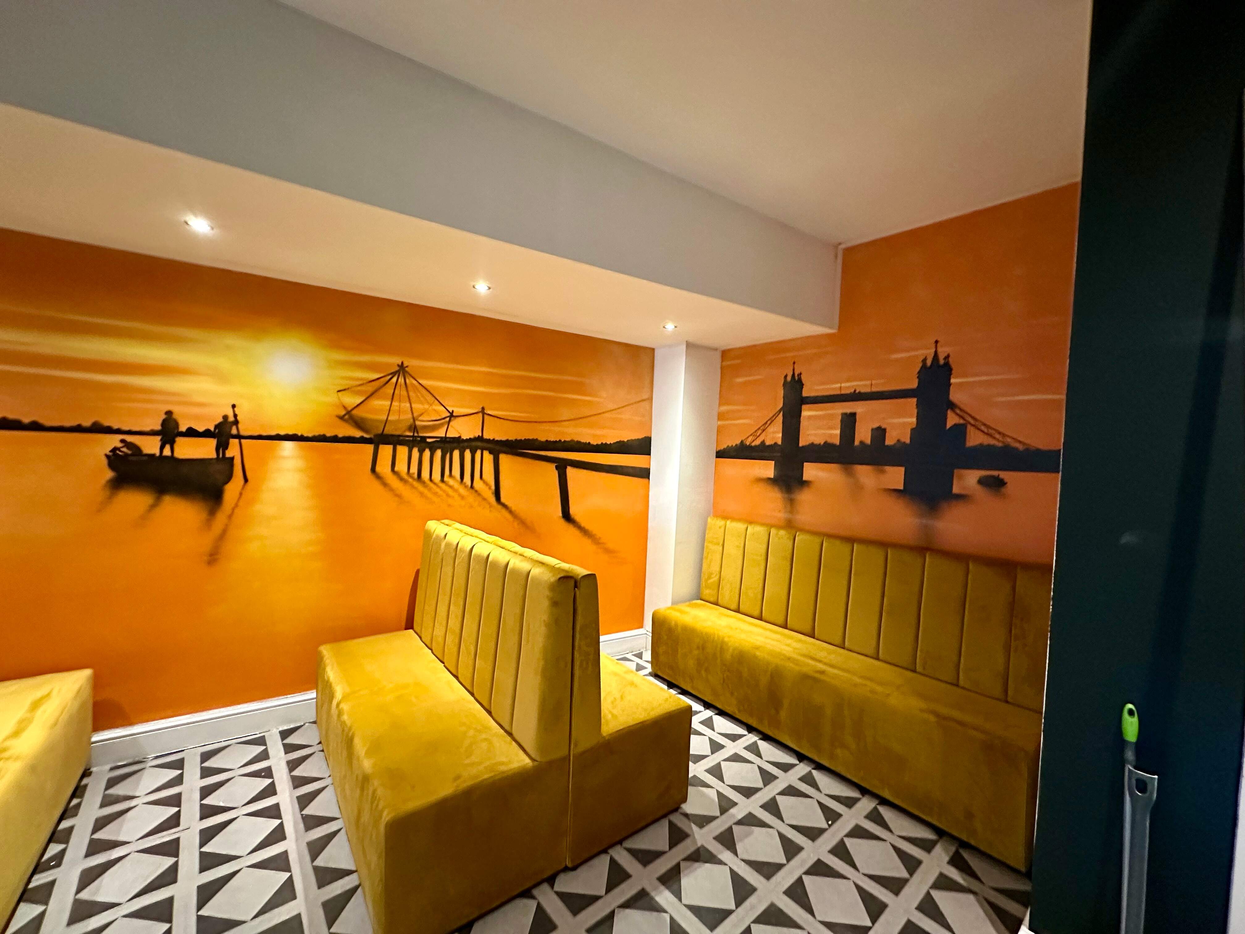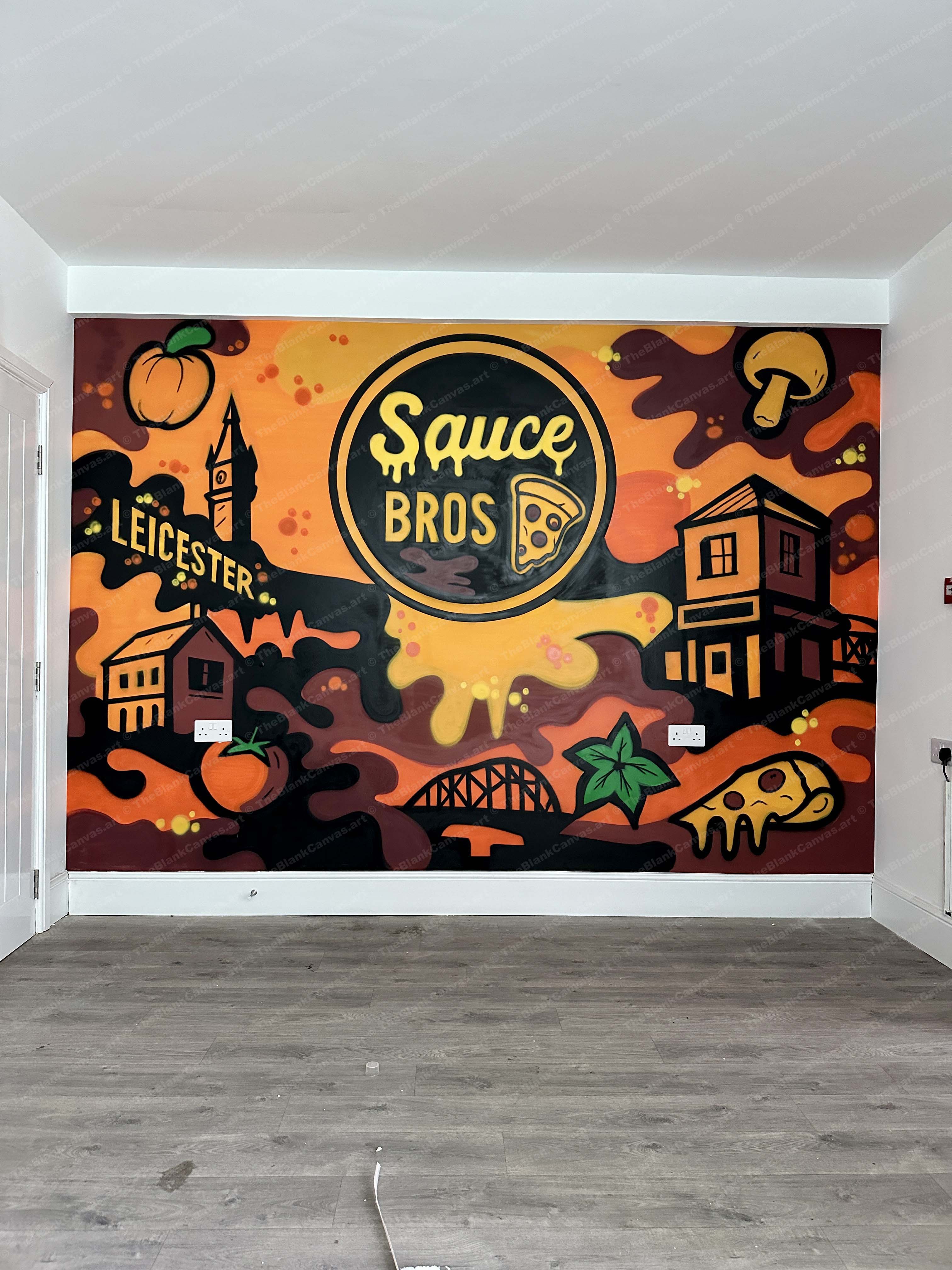 A vibrant hand-painted mural for Sauce Bros Pizza in Leicester, incorporating the brand’s logo and colour palette to create a bold, cohesive interior feature. The piece also includes subtle references to local landmarks, celebrating the city’s character while enhancing the restaurant’s visual identity.