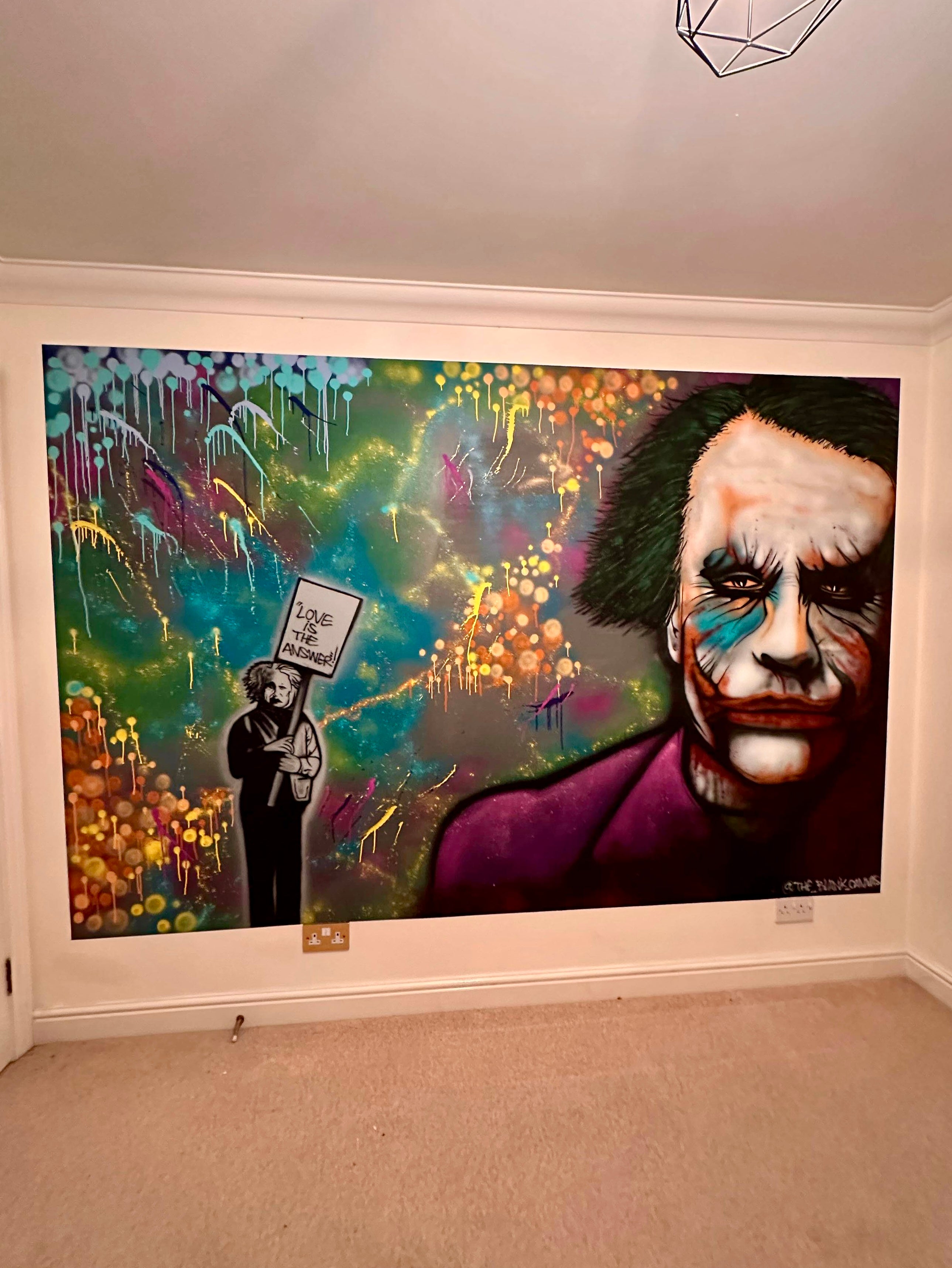 A hand painted mural —Heath Ledger’s Joker and Albert Einstein, as a reflection on the delicate balance between intellect, madness, and creativity. Set against a vivid, abstract background of cascading colour and energy, the composition juxtaposes chaos and reason.
