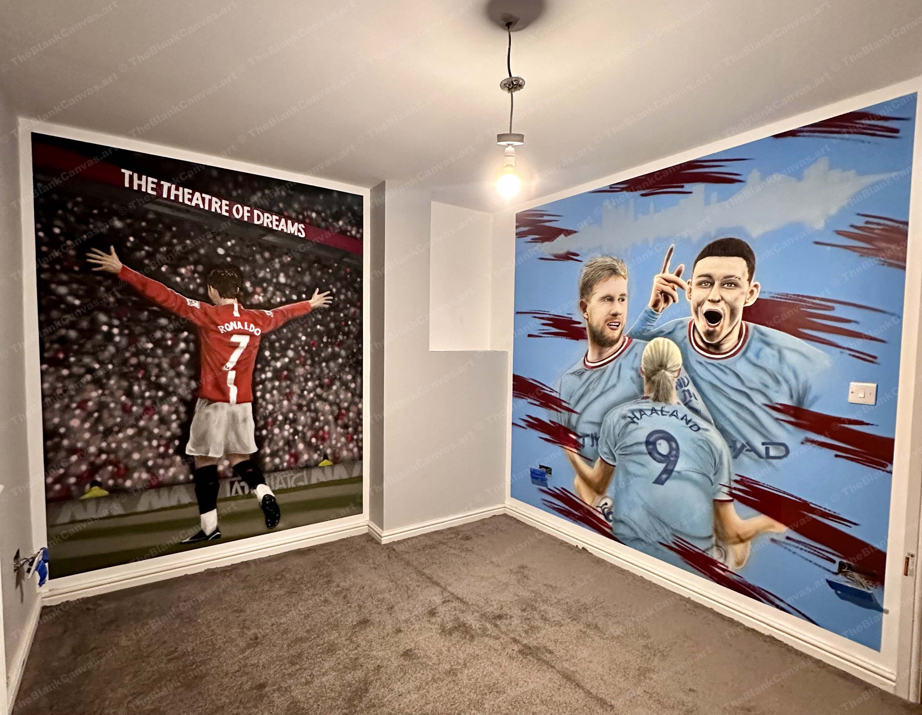 A hand painted mural created for two brothers who support rival football teams, Manchester United and Manchester City. The design features Cristiano Ronaldo celebrating at Old Trafford alongside Haaland, De Bruyne, and Foden in City blue, capturing the passion and rivalry of the Manchester derby within one bold, energetic space.