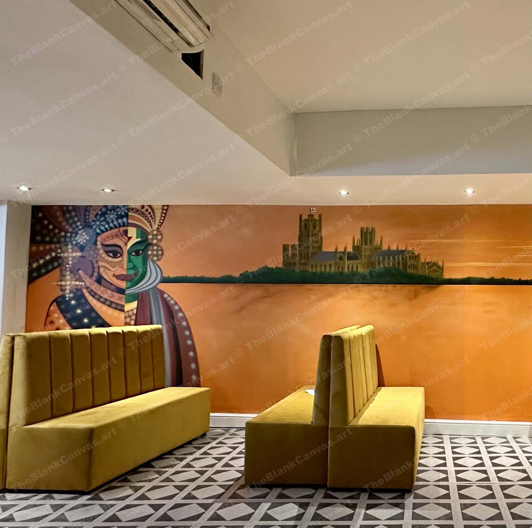 A hand-painted mural created for a South Indian restaurant in Ely Cambridge, combining the traditional artistry of Kathakali dance with a depiction of Ely Cathedral. The design celebrates the restaurant’s cultural roots while reflecting its unique location on the Cathedral’s doorstep, blending heritage and local identity in one vibrant piece.