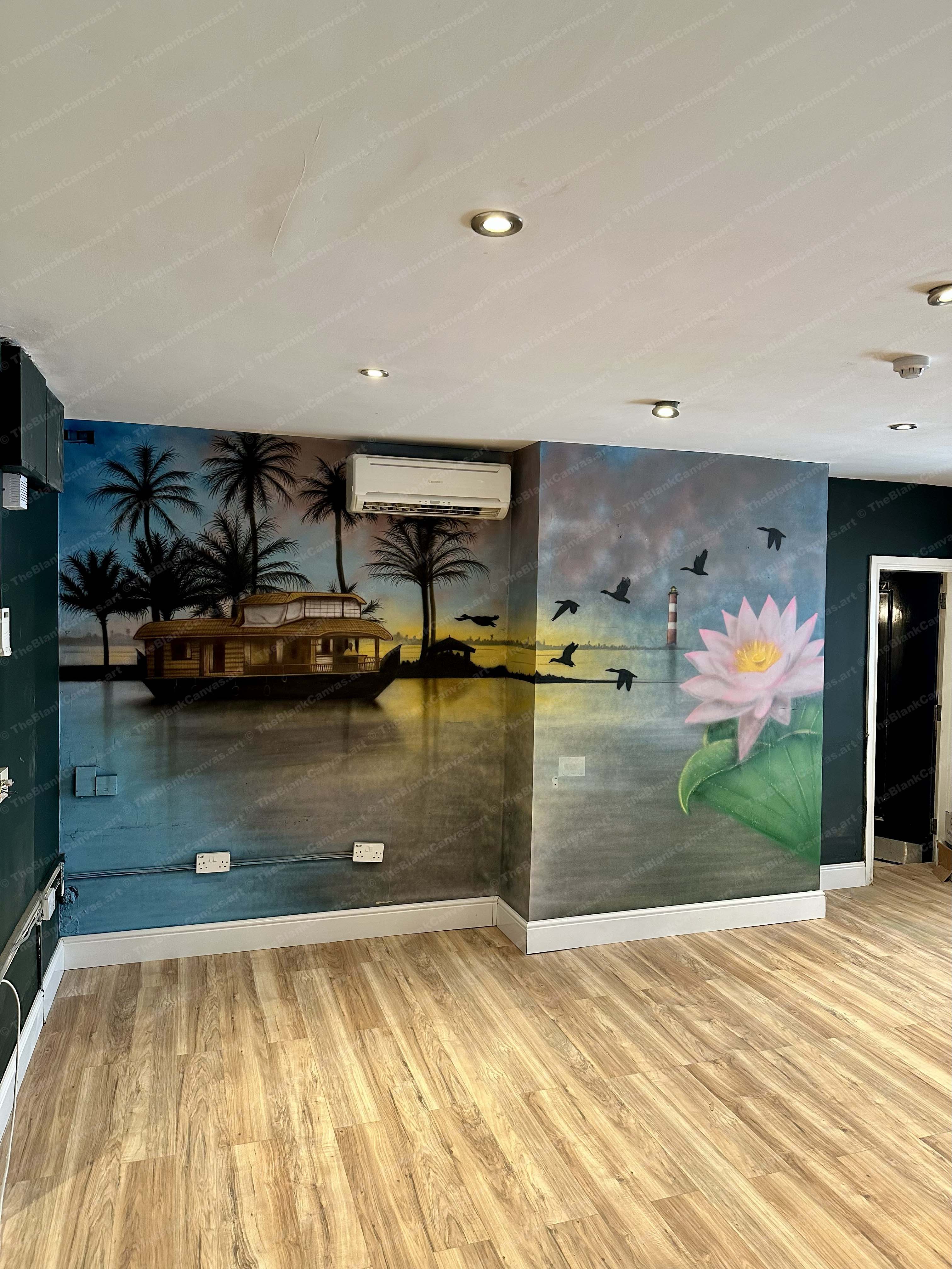 One of two Murals capturing the tranquil beauty of Kerala’s backwaters, featuring traditional houseboats, palm trees, and a sunrise horizon. Created to bring warmth and atmosphere to this South Indian restaurant.