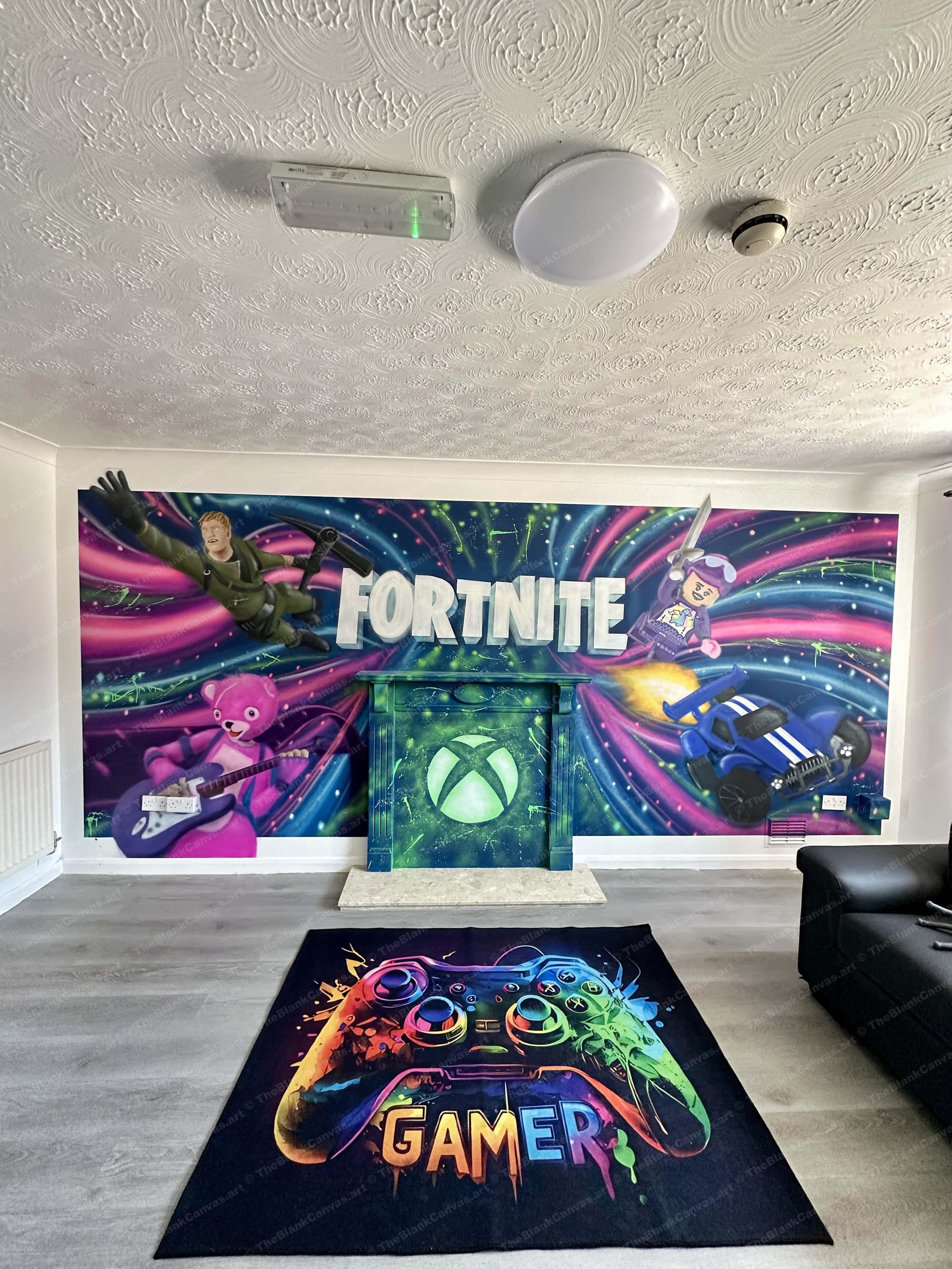 A vibrant Fortnite mural created for a young gaming enthusiast. Designed to transform the space into an immersive gaming environment.