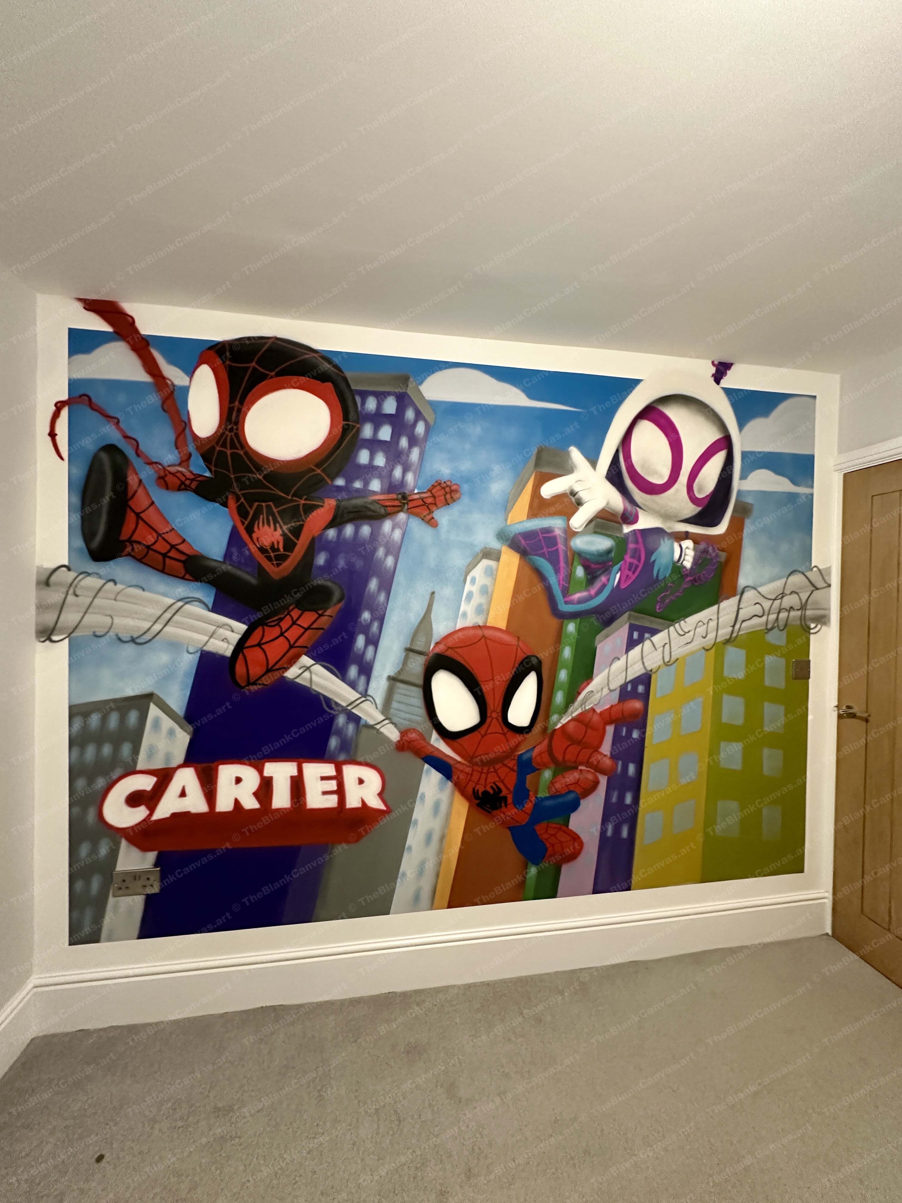 A vibrant hand-painted mural featuring Spidey and friends swinging through the city skyline. Created as a birthday surprise for Carter, the piece includes his name in the iconic Spider-Man font, creating a fun and personalised superhero space full of energy and colour.