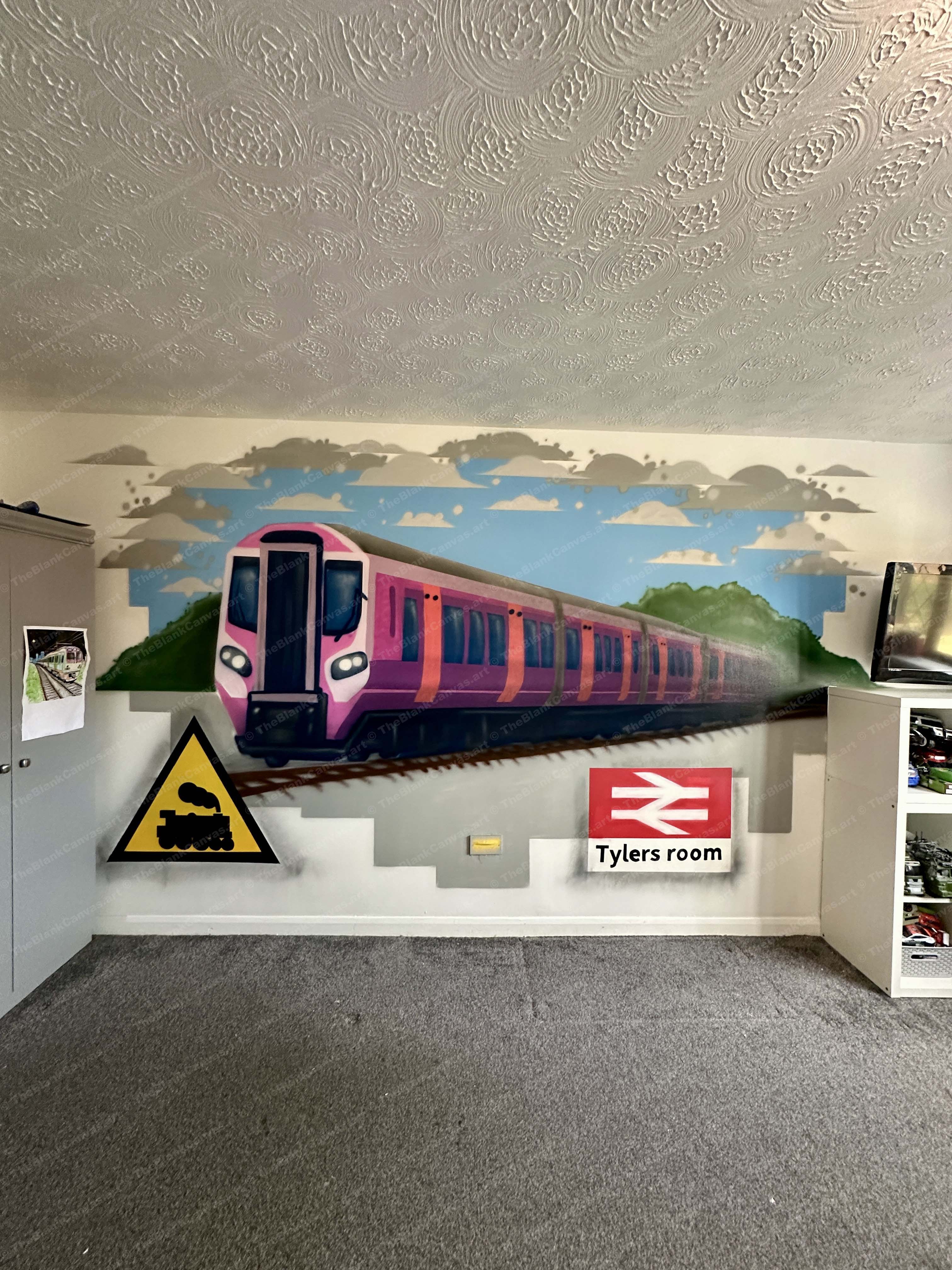 A custom hand-painted mural created for a young train enthusiast named Tyler. Featuring a vibrant modern train and personalised railway signage, the design transforms his room into a fun and imaginative space that reflects his passion for railways while adding a personal touch.