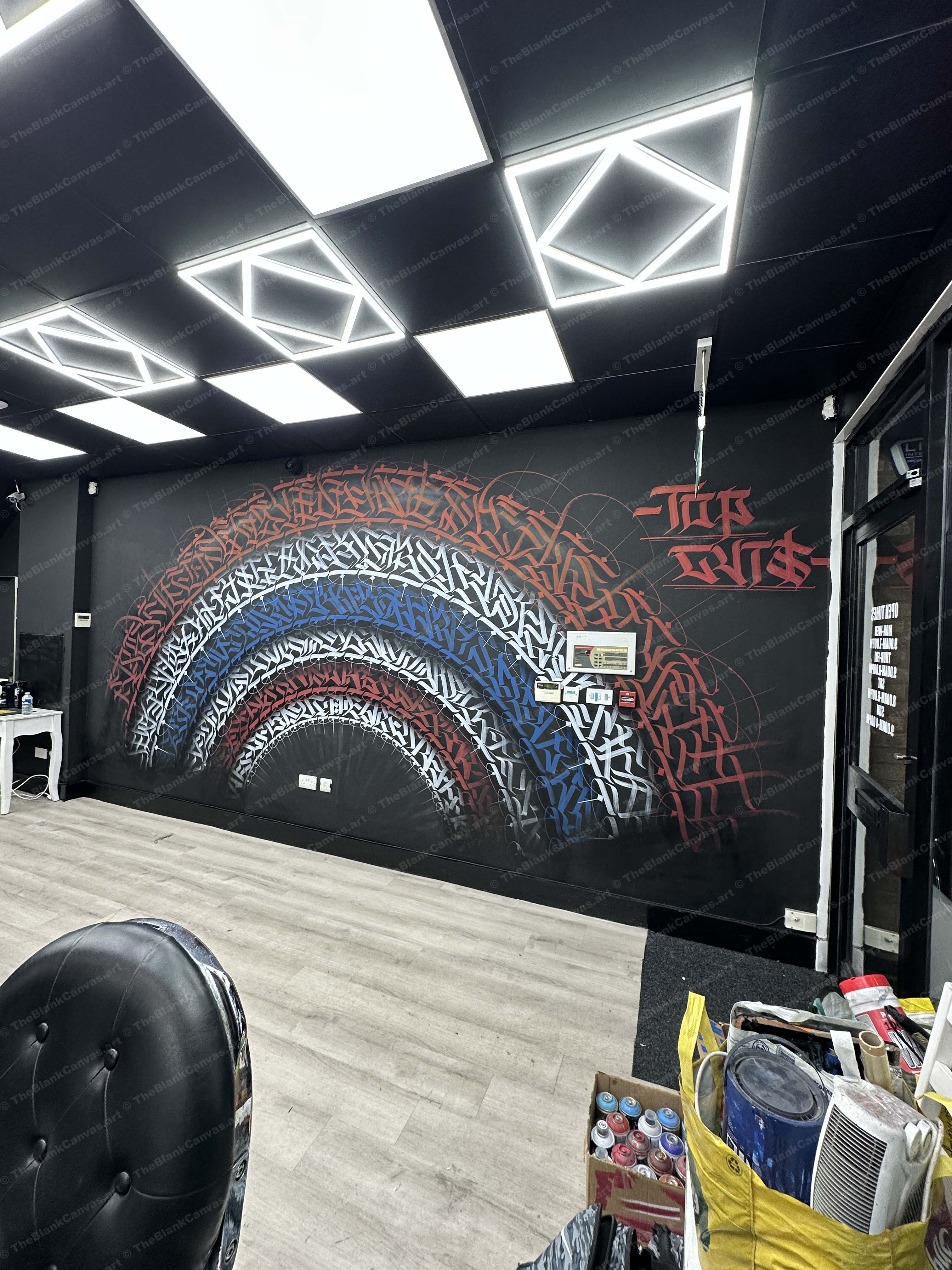 A bold, hand-painted calligraphy mural created to reflect the shop’s unique branding. Featuring layered red, white, and blue lettering, the design brings energy and identity to the space while complementing the modern interior style.